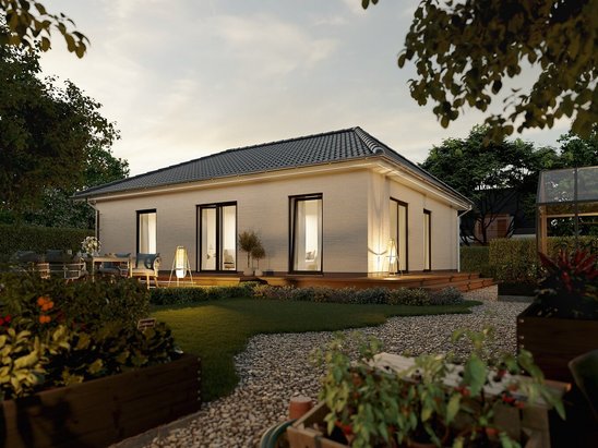 Der Bungalow 110 bietet auf einer Ebene viel Platz für die ganze Familie – mit hellem Wohnbereich, 3 Schlafzimmern und direktem Gartenzugang. Das Walmdach verleiht Charakter. Jetzt anfragen und stufenlos wohnen!