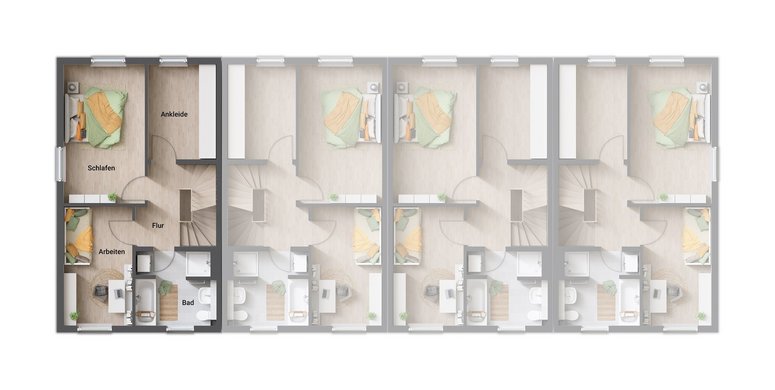 Das Reihenhaus Mainz 128 bietet Ihnen die ideale Kombination aus modernem Wohnen und effizienter Flächennutzung. Mit vier Wohneinheiten entsteht ein attraktives Zuhause, das zugleich Raum für Individualität und Gemeinschaft schafft. Jede Einheit verfügt über rund 140 Quadratmeter Wohnfläche, verteilt auf drei Etagen mit einem großzügigen Wohn- und Essbereich im Erdgeschoss, komfortablen Schlaf- und Kinderzimmern im Obergeschoss sowie einem vielseitig nutzbaren Studio im Dachgeschoss.