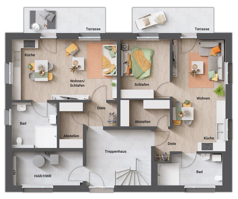 Ob zur Vermietung, für mehrere Generationen oder als gemeinsames Zuhause für Freunde: Das Quattro 287 bietet flexible Wohnkonzepte auf kompakter Fläche. Ideal für alle, die Wohnraum effizient nutzen und gleichzeitig in zukunftssichere Werte investieren wollen.